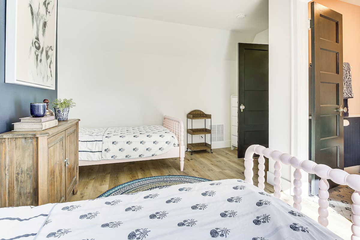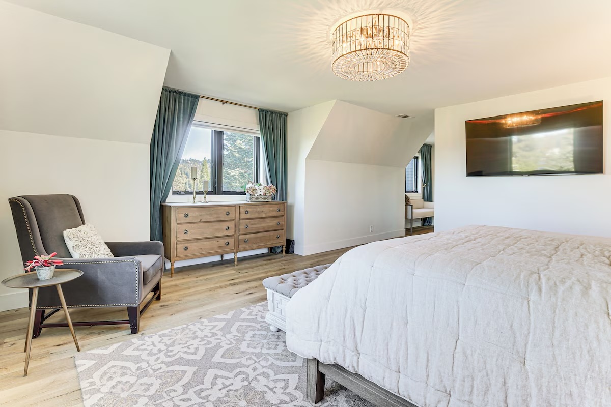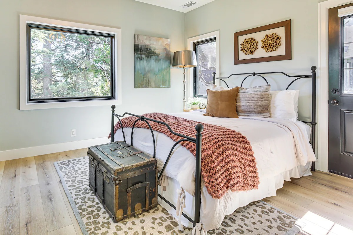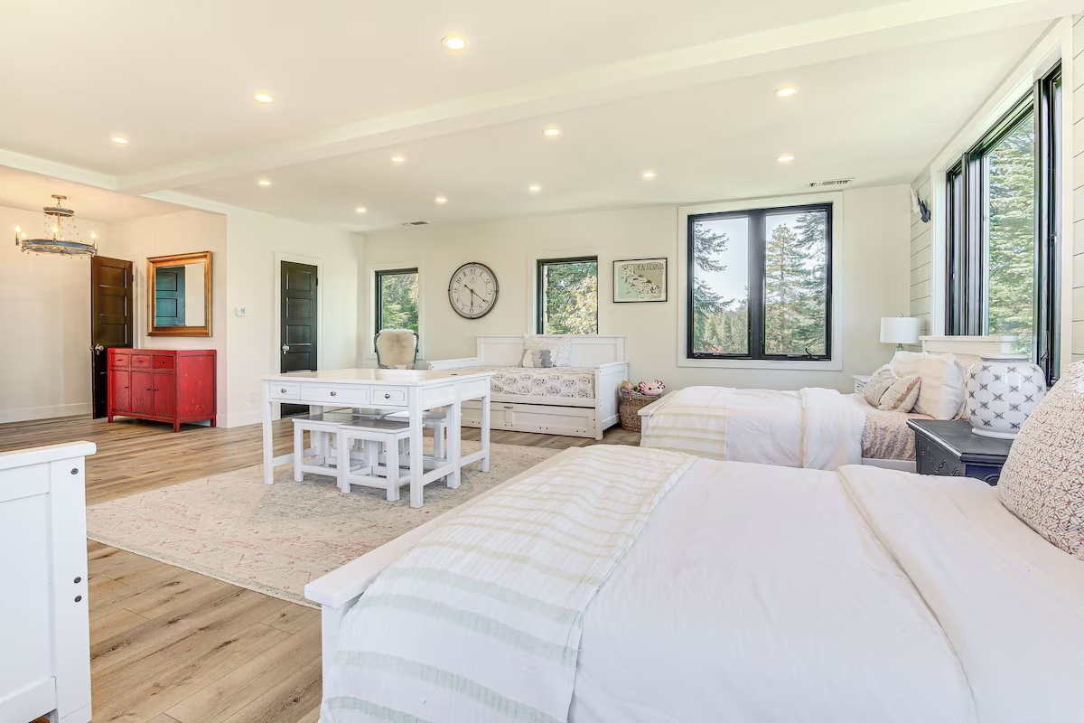 Altitude Haus Bedroom 6 is a beautiful, large private bedroom, sleeping up to 6x athletes in 2x Double beds, 2x Twin Beds and 2x pull-out Twin Trundle Beds with a private en-suite bathroom. The bedroom also features scenic views in every direction, including Lake Arrowhead.