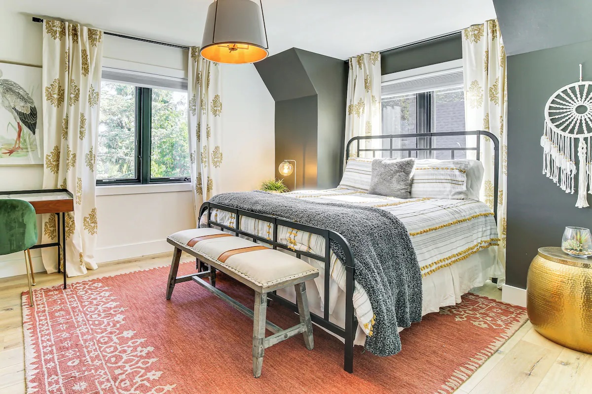 Altitude Haus Bedroom 5 is a beautiful, standard-size private bedroom, sleeping up to 2x athletes in 1x Queen bed with a private en-suite bathroom featuring a shower tub. The bedroom also features multiple windows with scenic views.